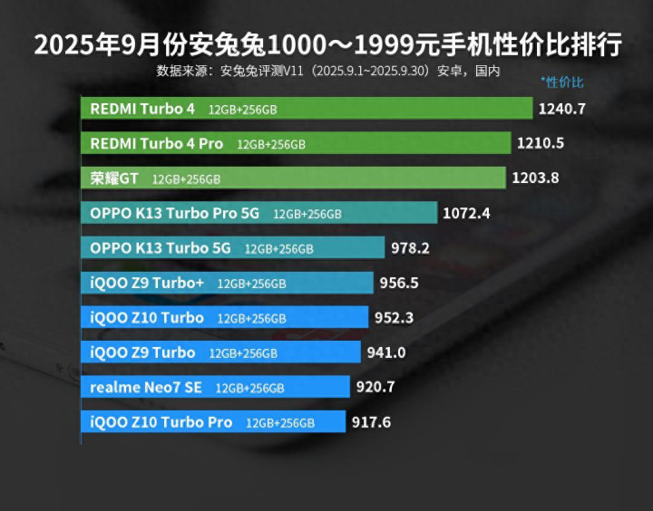 对于2025年9月安兔兔千元机性价比榜单,亓纪的想法是这样的:预算在1400元左右,搭载天玑8400的红米Turbo4是一个不错的选择,如果对续航有更高的需求,可以看看隔壁的iQOO Z10Turbo。如果你对性能有更高的需求,第四代骁龙8s芯片了解一下,对应的机型是红米Turbo4 Pro、iQOO Z10 Turbo和OPPO K13Turbo Pro,三款机型的售价都在1600元左右。