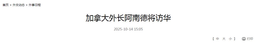 应中共中央政治局委员、外交部长王毅邀请,加拿大外长阿南德将于10月16日至17日访华。