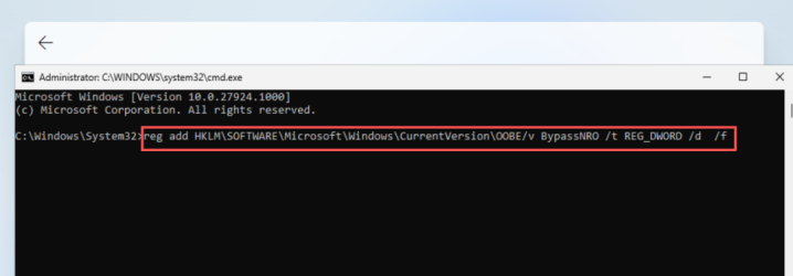 reg add HKLM\SOFTWARE\Microsoft\Windows\CurrentVersion\OOBE /v BypassNRO /t REG_DWORD /d 1 /f